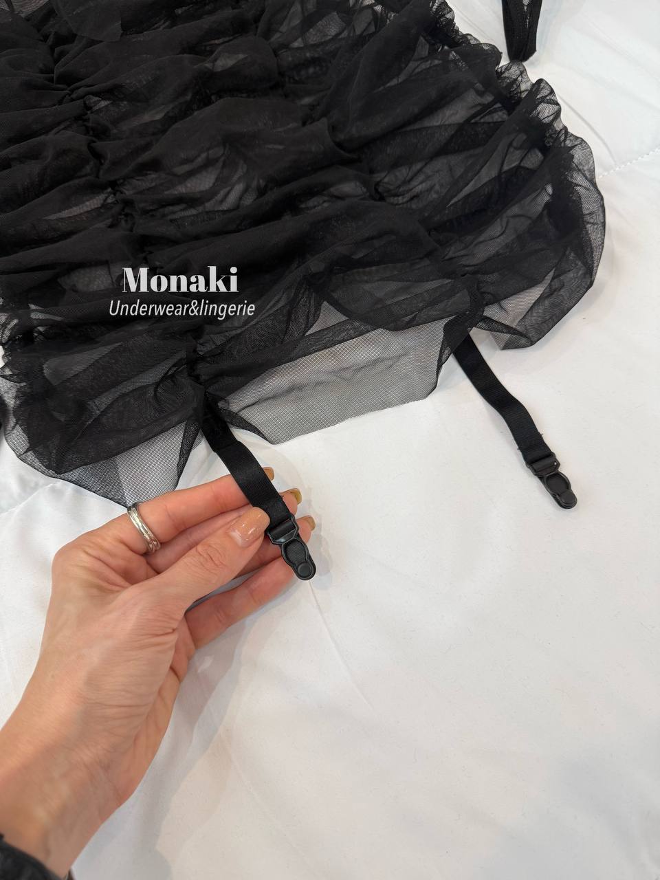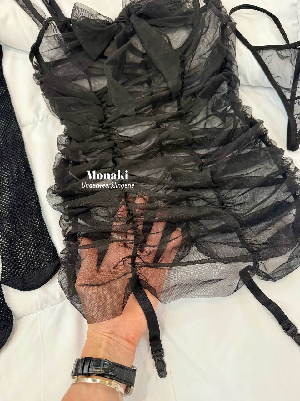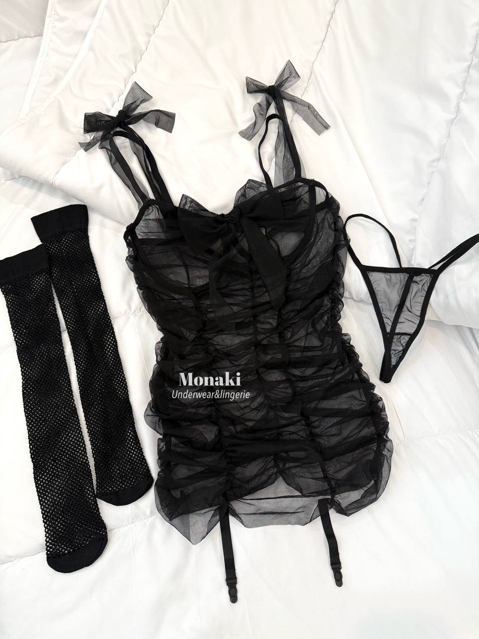 پک سه تیکه شامل: پیراهن بدنمای شیشه ای زیر سبنه فنردار و بند جوراب متصل ،جوراب فیشنت و لامبادا